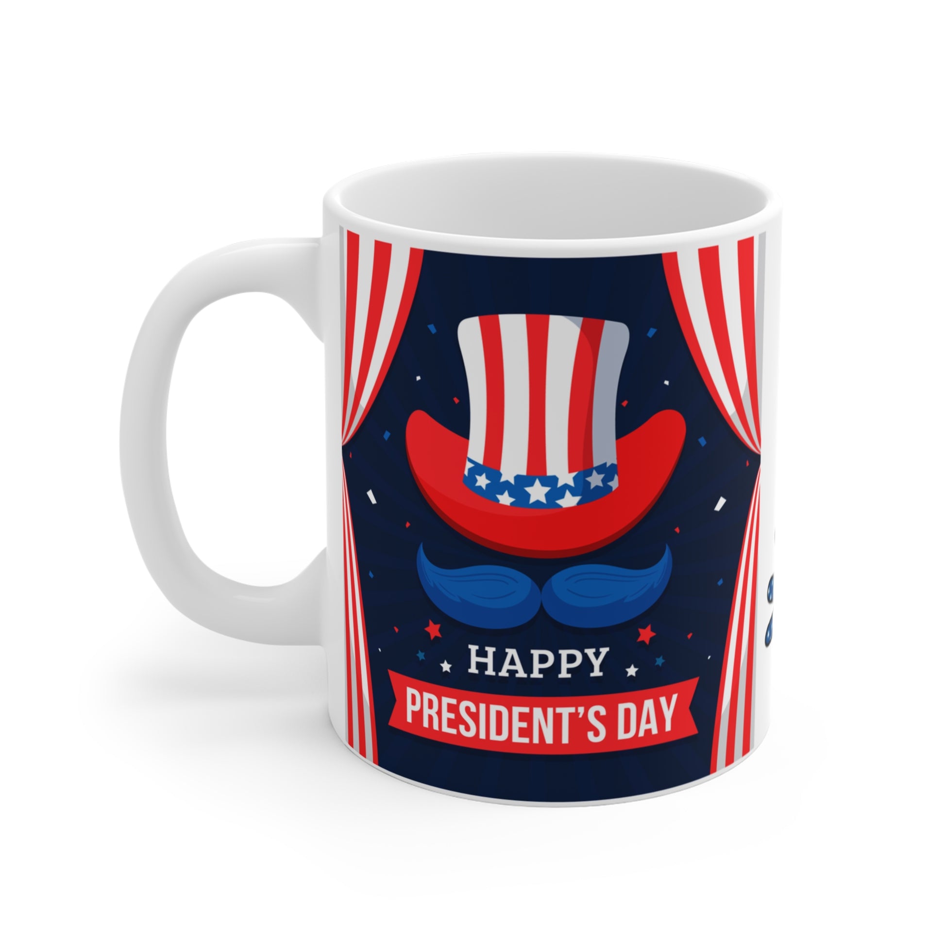 This Happy President's Day Coffe Mug 11oz exudes a festive and patriotic vibe, perfect for celebrating the holiday. It is ideal for those who enjoy a cup of coffee or tea while commemorating President's Day. The design adds a touch of joy and patriotism to your morning routine.